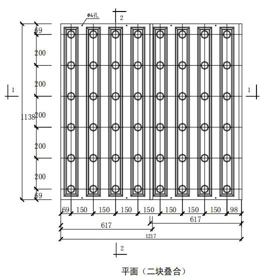 C型模板:濾板厚度為120mm,其承載正向強度不小于80kN/m2反向強度不小于80kN/m 2(改變配筋由設計根據(jù)承載強度復核重新配置)。縱向主筋Φ10應埋設在模板凹槽內(nèi)。橫向主筋Φ12應與濾板支 撐預留鋼筋Φ12焊接。